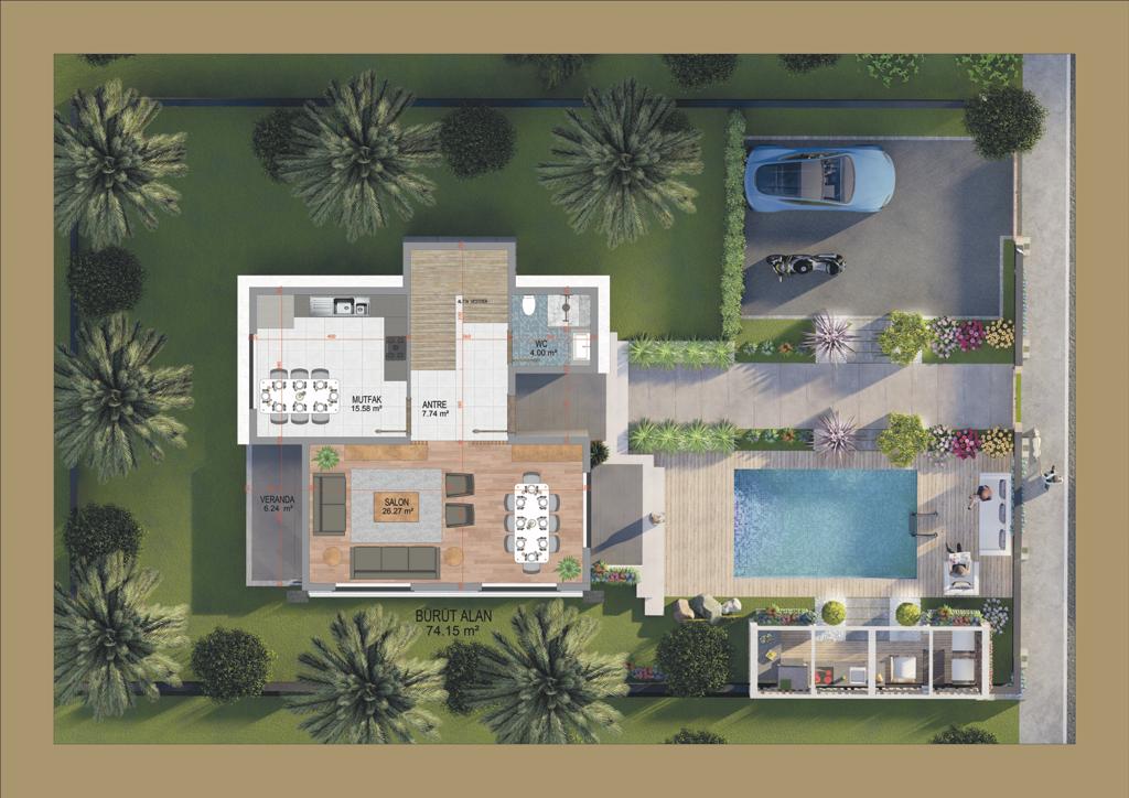 The view of the villa is south and it benefits from the permanent south wind of Antalya from the sea.